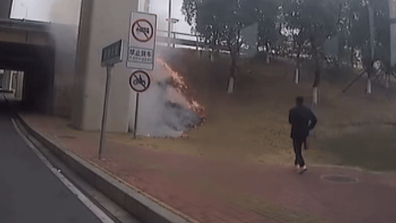 一路边绿化带上的草坪起火