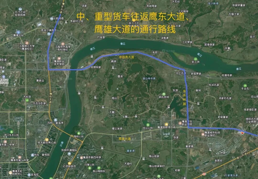 请由鹰东大道、鹰东高速路口方向前往鹰雄大道方向行驶的中、重型货车通过月湖特大桥、余信贵大道、东外环路、鹰雄大道路段通行;