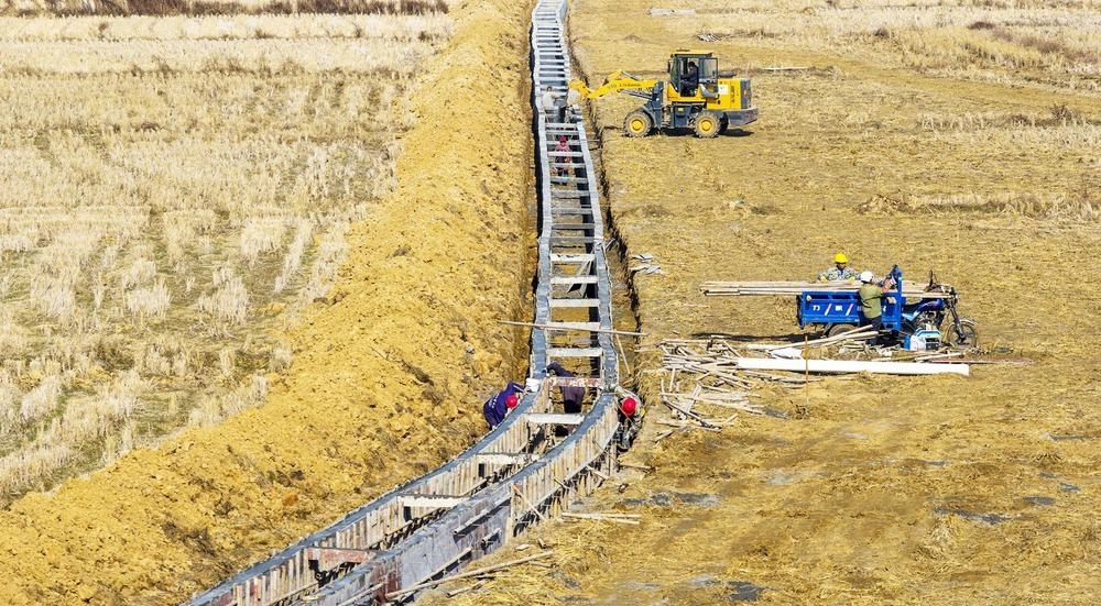 近日,施工人员在樟树市昌傅镇太平村高标准农田建设点进行灌溉水渠建设作业。入冬以来,樟树市抢抓冬闲时节全面推进高标准农田建设,通过田块整治、水利配套等措施,提升耕地质量和农田基础设施水平,为粮食稳产增收夯实基础。