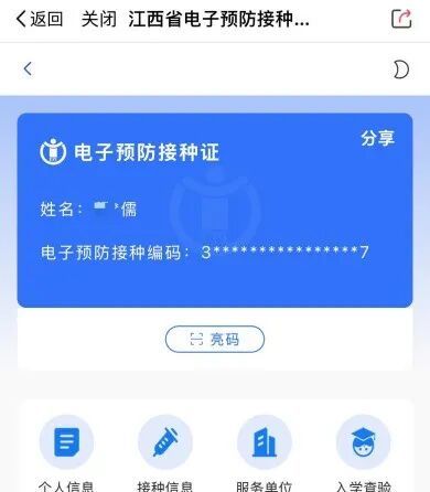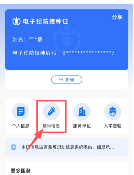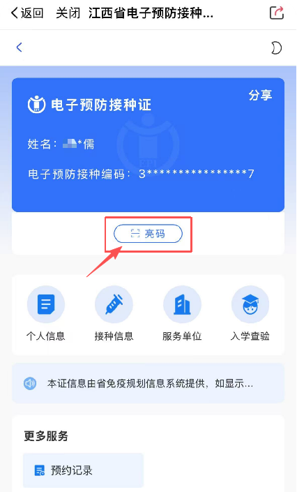 2.亮码:打开已申领的电子预防接种证,点击“亮码”,即可显示申领人的二维码,实现亮码接种。