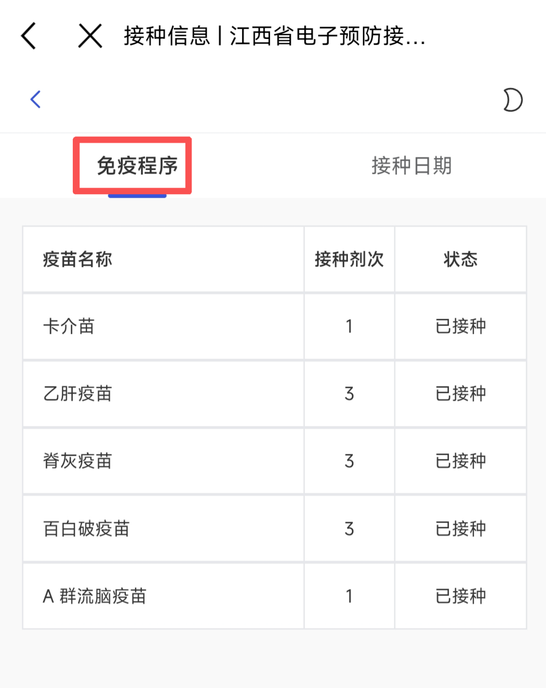 1.查询接种信息:点击“接种信息”,即可按“免疫程序”或“接种日期”查看疫苗接种记录。