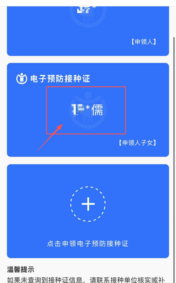 4.填入申领人(被监护人)“姓名和身份证号码”,点击“申领”后即可生成电子预防接种证。