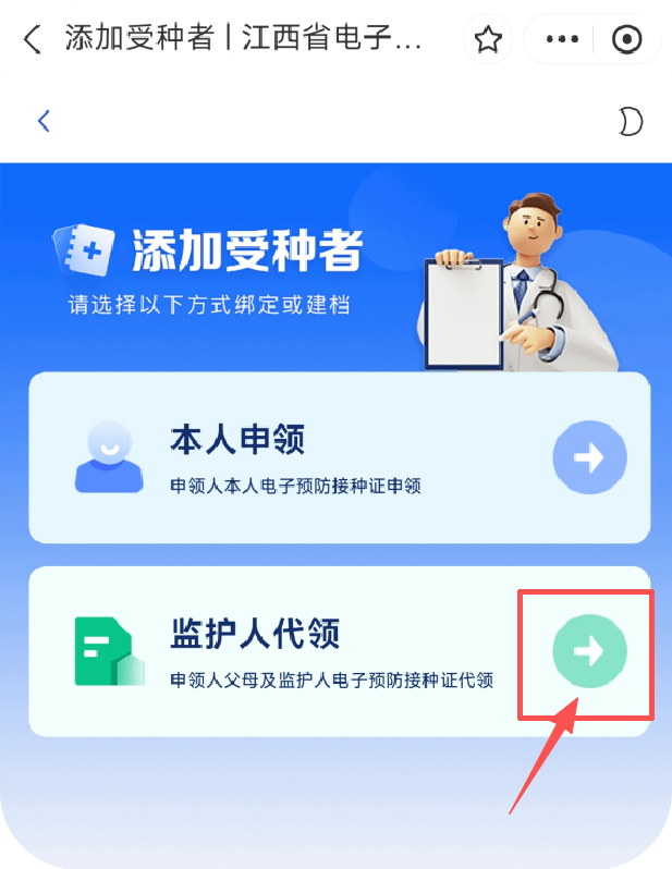 3.在“点击申领电子预防接种证”页面,点击“+”,进入到“添加受种者”页面,点击“监护人代领”。