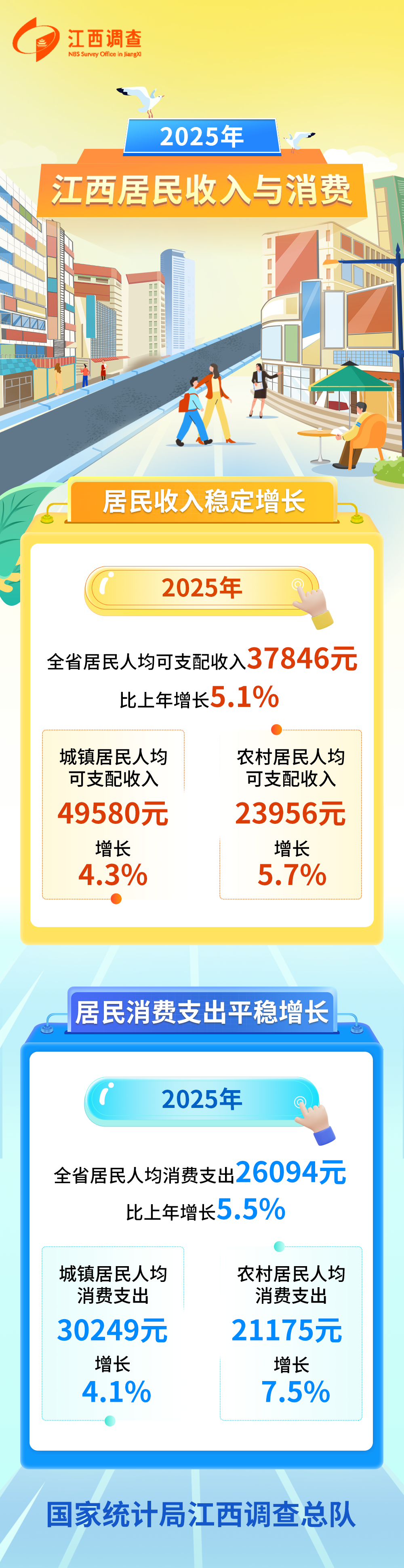 2025年,江西文旅市场火爆,据省文旅厅数据,国庆中秋假期江西实现旅游人次和游客花费双位数增长,消费活力带动经营活力,居民经营净收入保持较快增长。全省居民人均经营净收入6315元,比上年增长7.0%。分城乡看,城镇居民和农村居民人均经营净收入分别增长12.9%和2.4%。