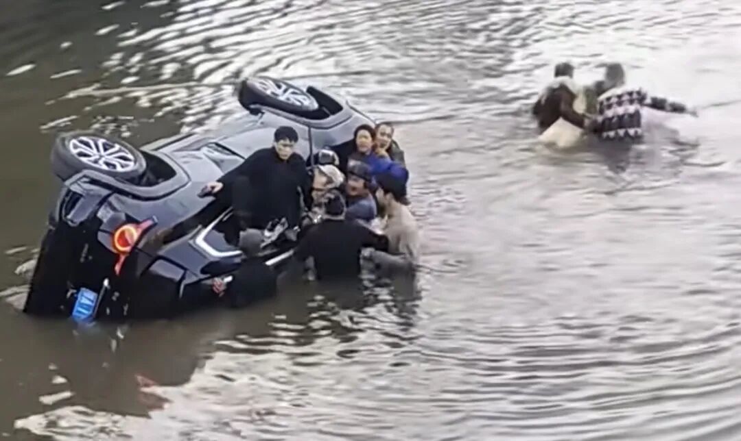 现场视频显示,事故车辆侧翻在河内,村民们相继下水,利用长棍破开车窗,协力将被困人员救出,整个过程紧张有序。