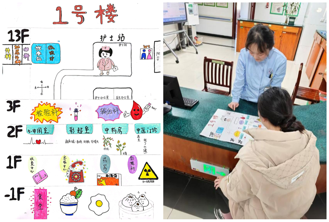 初次就诊患者在面对多层楼宇、复杂科室分布时,容易感到迷茫与紧张,“接下来该往哪走”成为就医路上额外的心理负担。为此,六病区护理团队共同策划,绘制了这份集方位指引、流程提示与便民信息于一体的指引图,希望成为患者身边的“无声向导”。这份指引图不仅是路径的指引,更是医院服务理念的延伸——从患者踏入病区的那一刻起,即通过细节传递关怀,减轻其身心负担。