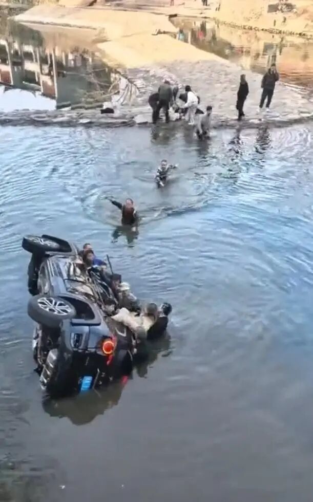 现场画面显示,车辆翻车落水后,多名热心市民不顾河水冰冷,主动入水救人,在首次开车门受阻后,他们又调整策略,利用各种工具尝试撬开车门。最终,四名落水人员被全部救出。