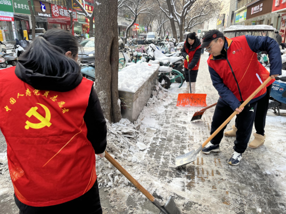 凛冽寒风中,志愿者们不畏严寒、干劲十足,手持铁锹、扫帚等工具,聚焦路口、人行道、公交站点等重点易滑区域,展开全方位、无死角的清雪除冰作业。忙碌的“国寿红”在皑皑白雪中来回穿梭。与此同时,党员志愿者主动化身“安全宣传员”,在清扫间隙耐心向过往群众、商户普及冬季出行防滑常识。