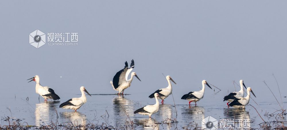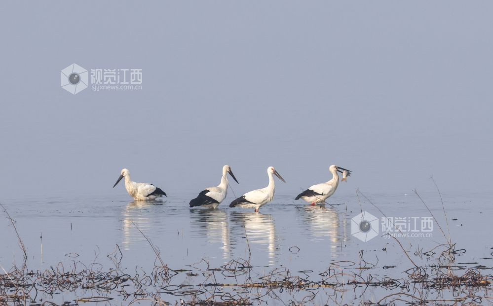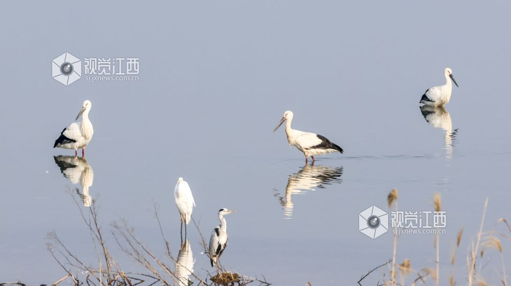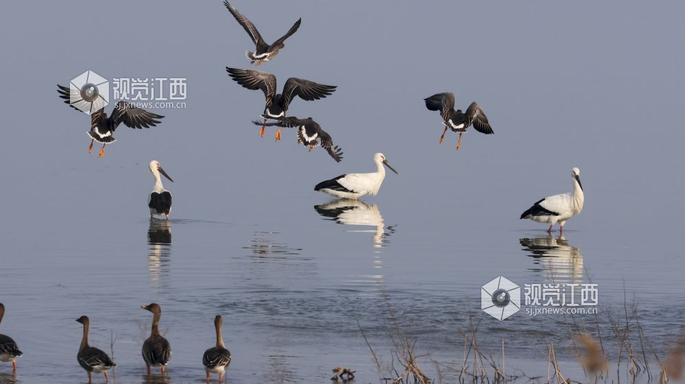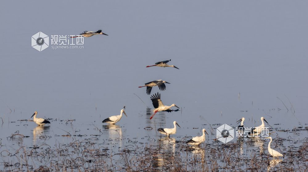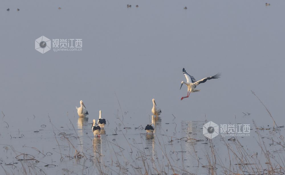 2026年1月24日,位于江西省瑞昌市、柴桑区之间的赤湖湿地,东方白鹳、大雁等候鸟在此觅食、栖息,构成一幅和谐的生态画卷。
