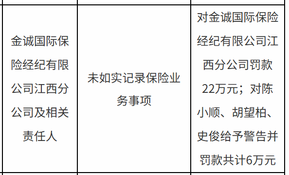 罚单显示,金诚国际保险经纪有限公司江西分公司的主要违法违规事实为:未如实记录保险业务事项。