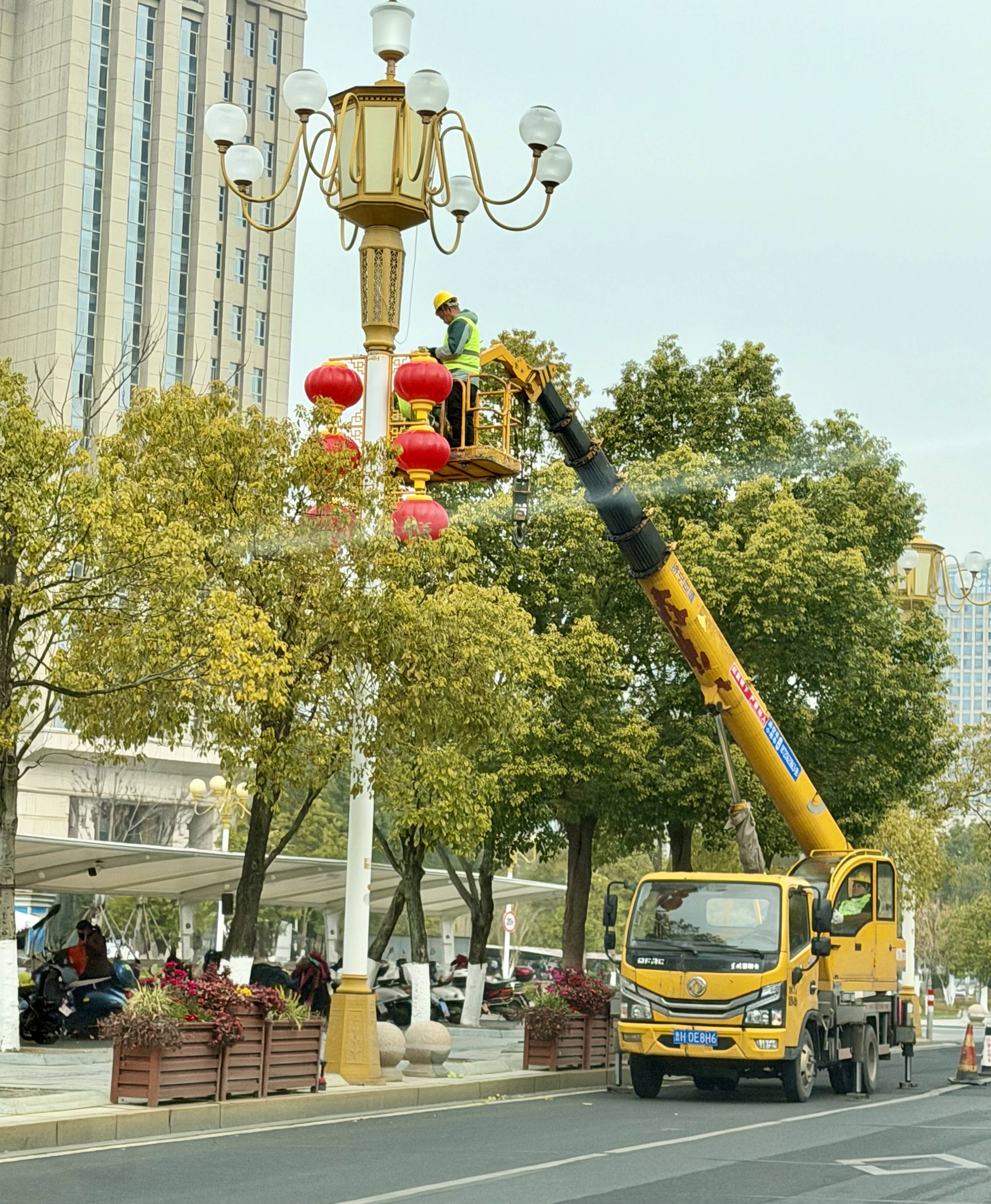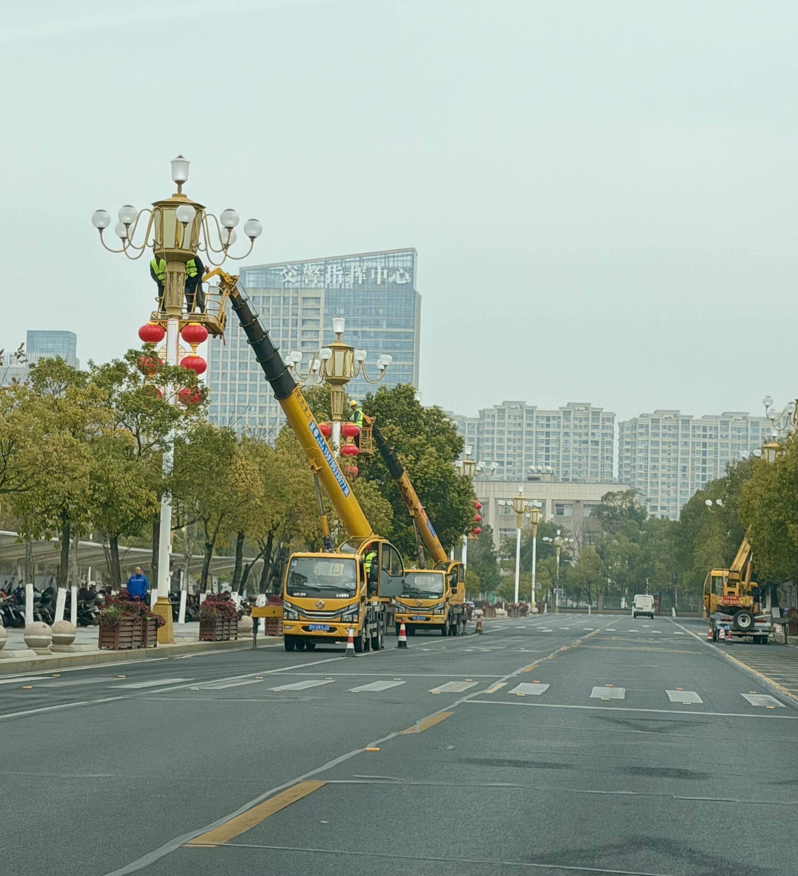 1月23日,在市行政中心府东路,市政工作人员正有条不紊地进行灯笼悬挂作业。一盏盏大红灯笼整齐排列,成为城市一道亮丽的风景线。
