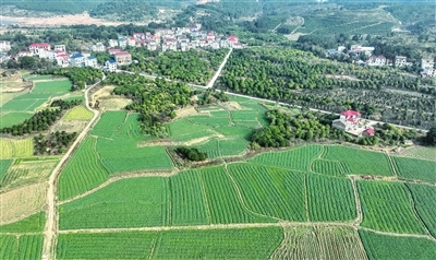 近日,莲花县升坊镇石江村,成片的果蔬基地与青山、民居相互映衬,构成了一幅乡村田园画卷。近年来,莲花县优化农业产业结构,开展植树造林,实施田块整治,修建水利设施,促进农业增效、农民增收,助推美丽乡村建设。