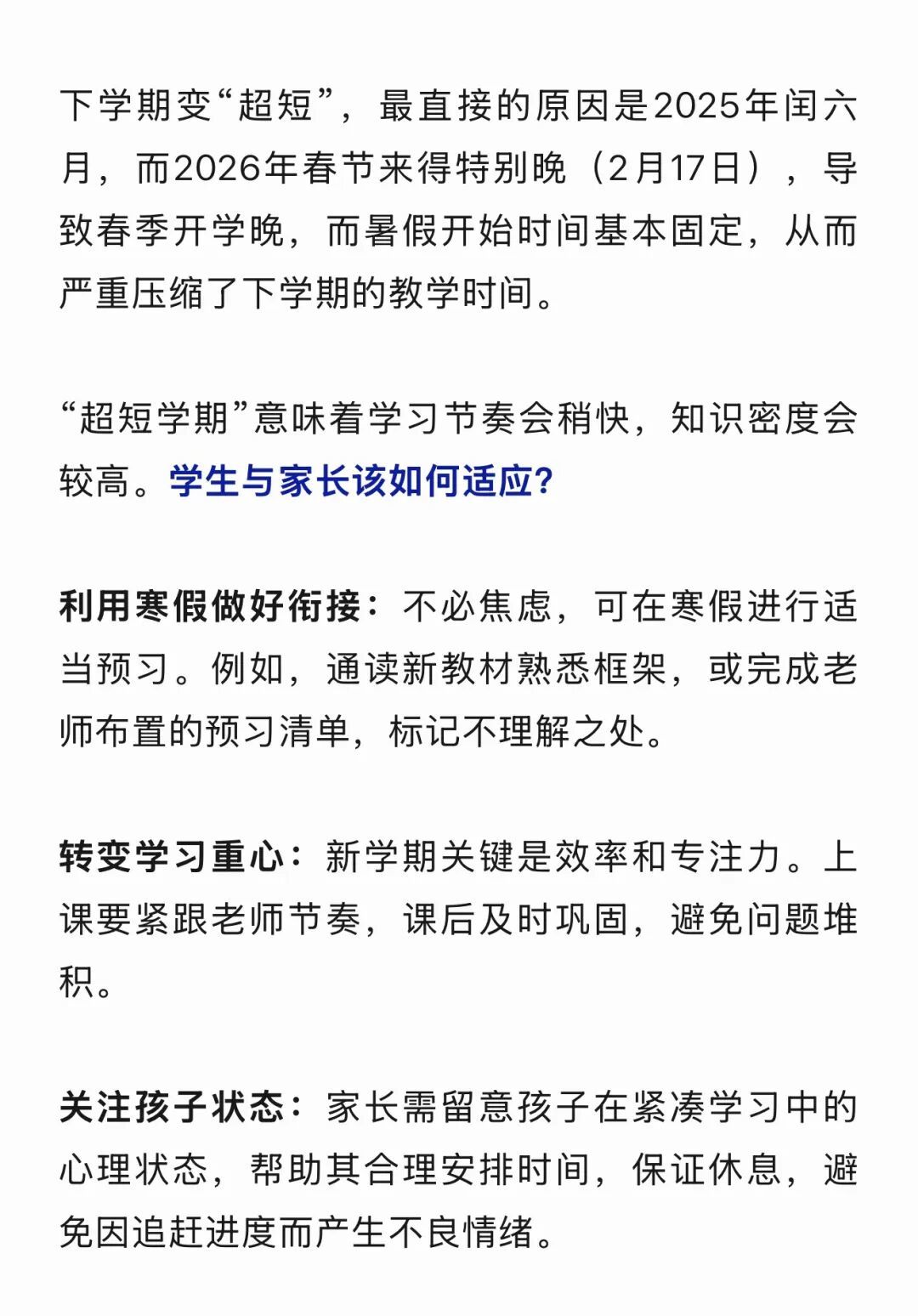 目前,南昌市中小学生已进入期末阶段,超长学期终于要画上句号,与之相对应的是,下个学期将直接切换为“超短模式”!按照教学规划,春季学期总时长约为18周(高三年级约为19周),实际教学天数约80天。