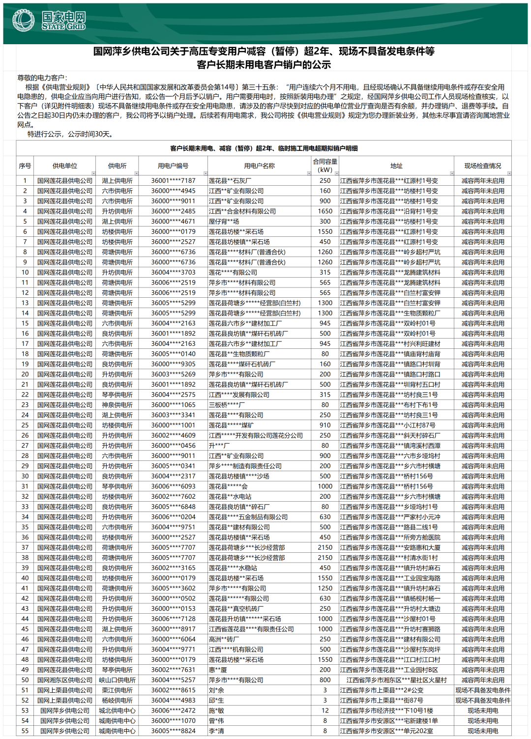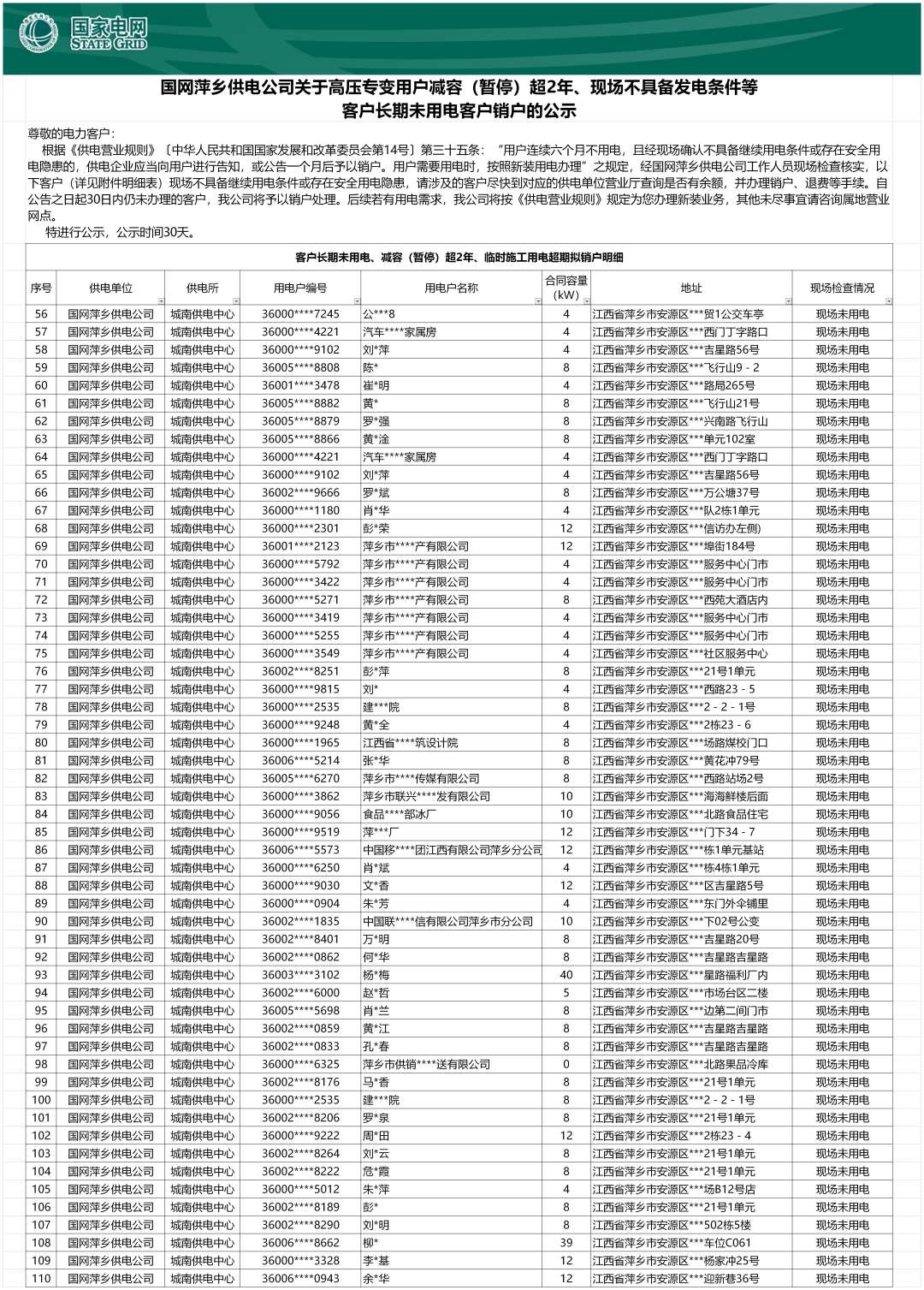 根据《供电营业规则》〔中华人民共和国国家发展和改革委员会 第14号〕第三十五条:“用户连续六个月不用电,且经现场确认不具备继续用电条件或存在安全用电隐患的,供电企业应当向用户进行告知,或公告一个月后予以销户。用户需要用电时,按照新装用电办理”之规定,经国网萍乡供电公司工作人员现场检查核实,以下客户(详见附件明细表)现场不具备继续用电条件或存在安全用电隐患,请涉及的客户尽快到对应的供电单位营业厅查询是否有余额,并办理销户、退费等手续。自公告之日起30日内仍未办理的客户,我公司将予以销户处理。后续若有用电需求,我公司将按《供电营业规则》规定为您办理新装业务,其他未尽事宜请咨询属地营业网点。