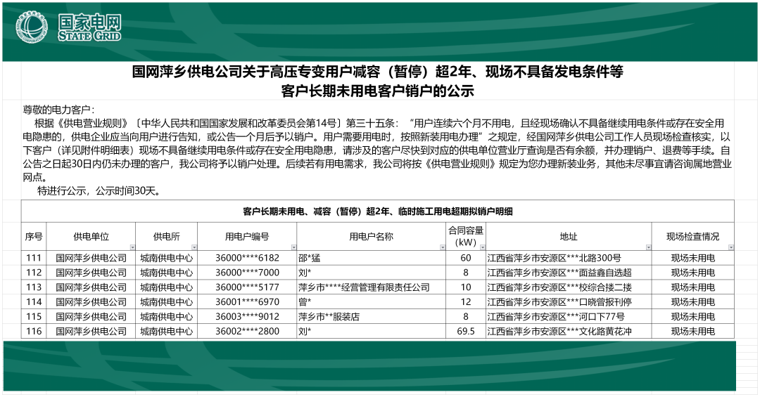 国网萍乡供电公司关于高压专变用户减容(暂停)超2年、现场不具备发电条件等客户长期未用电客户销户的公示