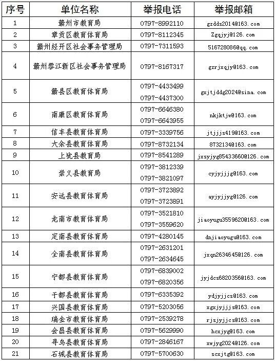 赣州市教育局和各县(市、区)教育部门“三违”治理举报电话及邮箱