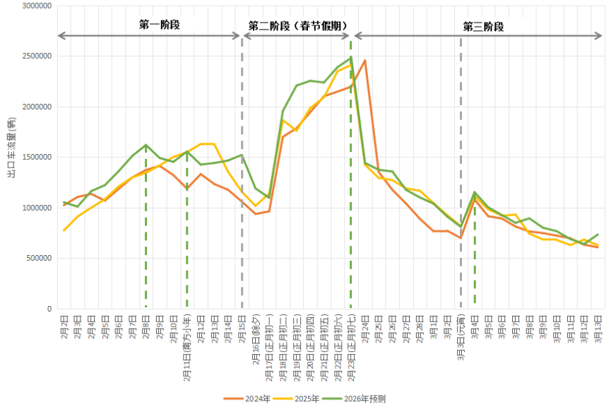 2026年春运从2月2日至3月13日,为期40天,可分为以下三个阶段: