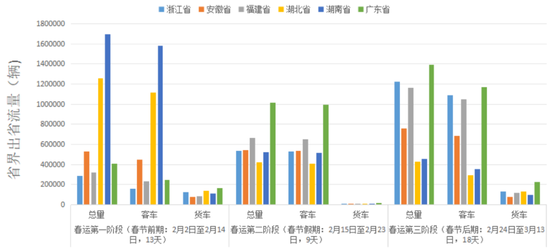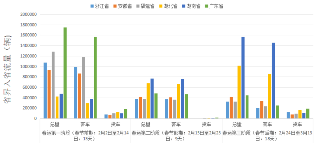 ❖ 春运第三阶段入省客车主要来自于湖南省、湖北省,出省客车的方向以广东省、浙江省、福建省为主。货车出入省流量开始回升。