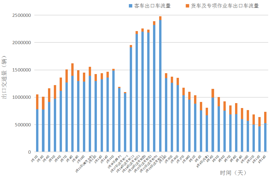 春运后期,车流量由峰值逐步回落并保持平稳下行态势,于元宵节后一天(3月4日)春运最后一个小高峰,随后继续下降直至日常平稳运行水平。