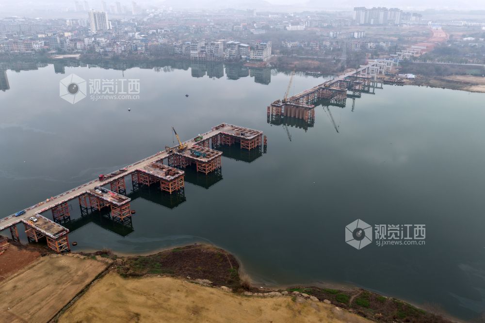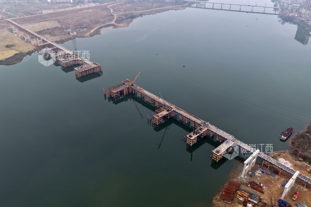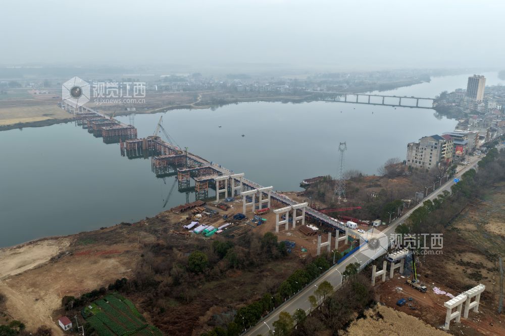全长1193米的新黄金埠特大桥,位于江西省余干县黄金埠镇和梅港乡,横跨信江河,为G236芜汕线余干县黄金埠段改建工程项目核心控制性工程。大桥按双向四车道一级公路标准建设,设计时速60公里,项目总投资超4亿元,为江西省重点项目工程。