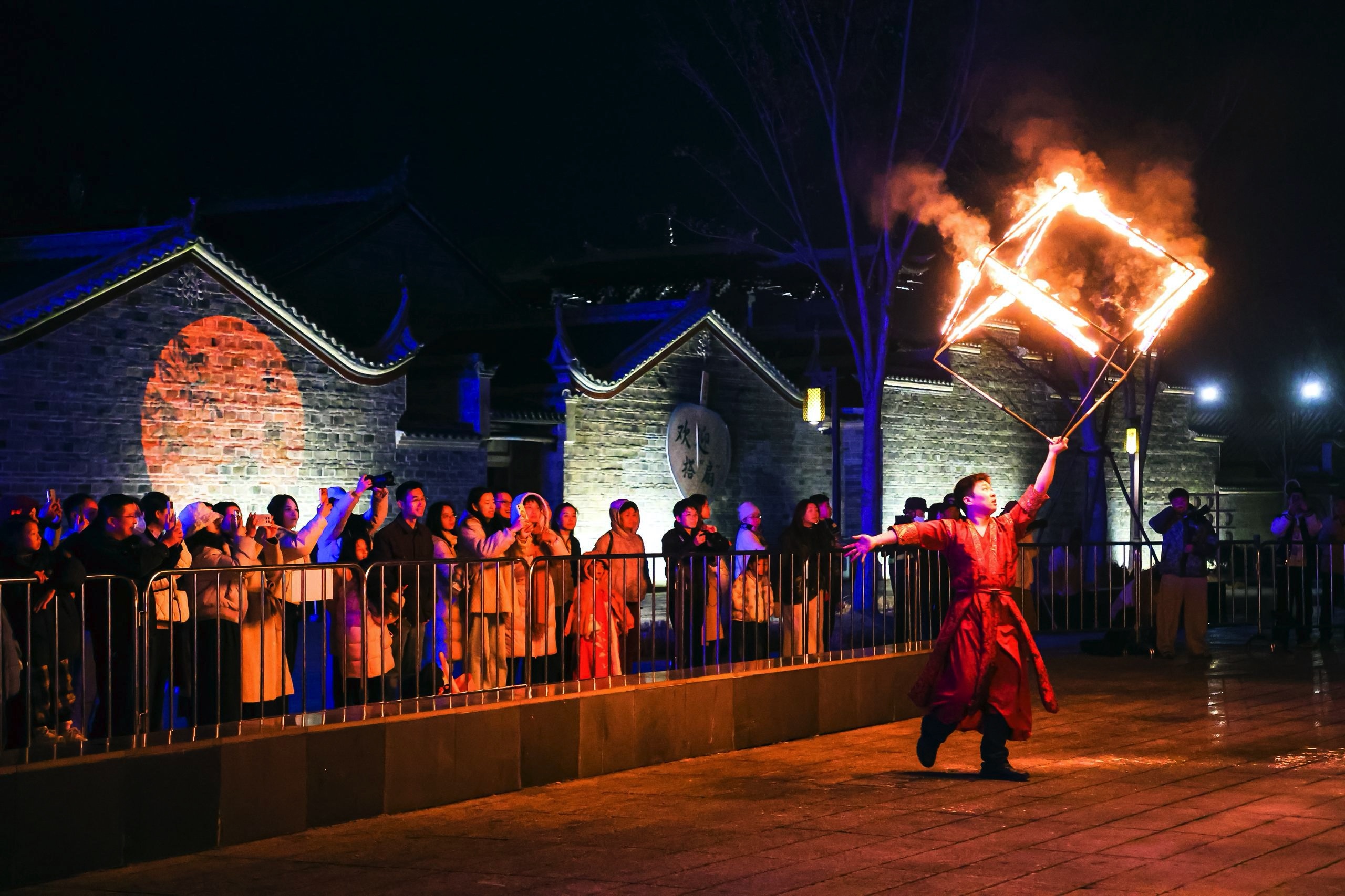 赣南红客户端讯(记者孙晋鹏)1月31日晚,赣州七鲤古镇景区举办新春游园活动,火焰艺术表演吸引众多游客驻足欣赏。
