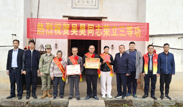 大江新闻讯 江西日报全媒体记者付睿 通讯员李春雨报道:近期,兴国县退役军人事务局联合县人民武装部、县关爱退役军人协会以及均村乡党委政府组成庆送喜报小组,一路敲锣打鼓、鞭炮齐鸣,举着“热烈祝贺吴昊同志荣立三等功”横幅前往现役军人吴昊家中送上立功喜报。