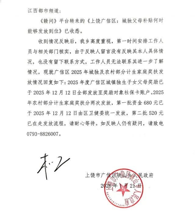 10、上饶市广信区铁山乡网友反映2025年独生子女父母奖励未发放。