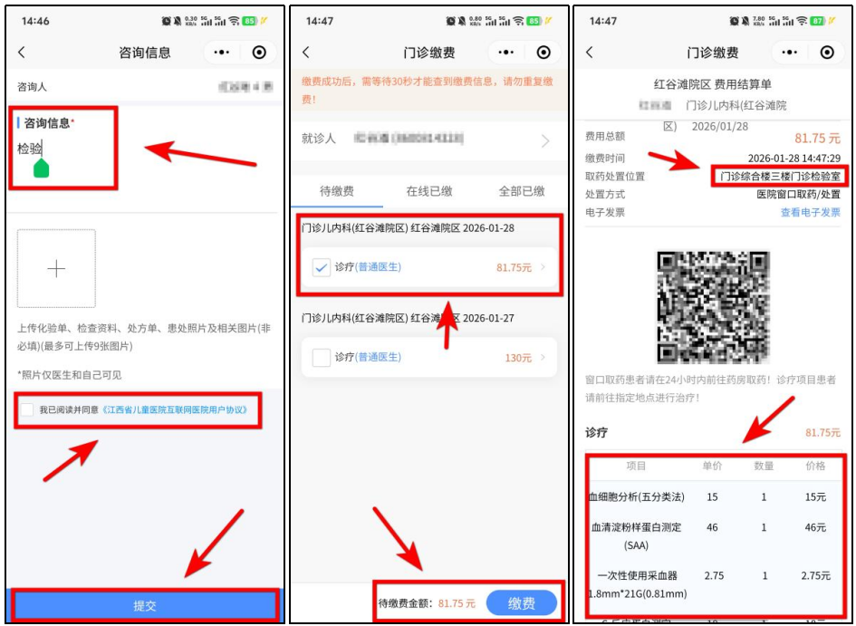 4.在咨询信息中输入“检验”,勾选下方同意知情同意书选项,点击下方提交按钮,提交后会自动跳转到缴费页面,勾选待缴费项并点击下方缴费按钮完成缴费,完成缴费后,可在“在线已缴”栏目中查看费用详情及检验执行位置。