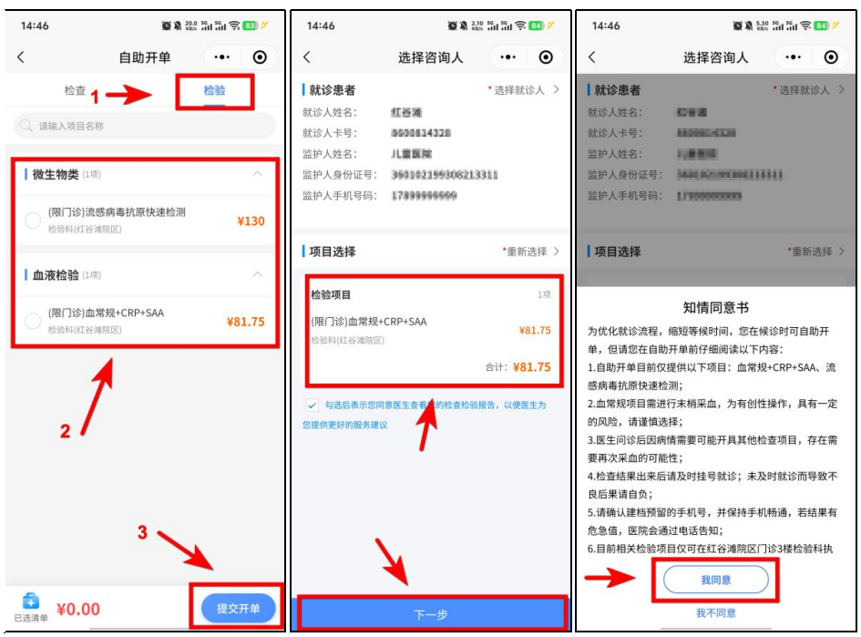 3.选择“检验”tab页,勾选需要做的检验项目(可多选),最后点击“提交开单”按钮,确认项目内容后点击“下一步”按钮,仔细阅读并同意弹出的知情同意书。