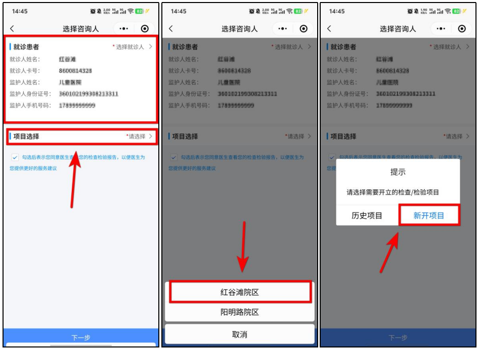 2.确认就诊人信息后,点击“项目选择”按钮。院区选择界面中,选择红谷滩院区,随后弹出页面中,选择“新开项目”按钮。