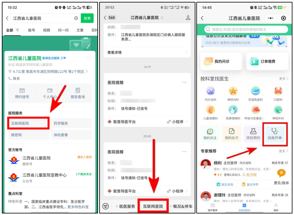 1.微信搜索“江西省儿童医院小程序”或通过“江西省儿童医院”公众号下方“互联网医院”按钮进入,下滑页面选择自助开单入口。