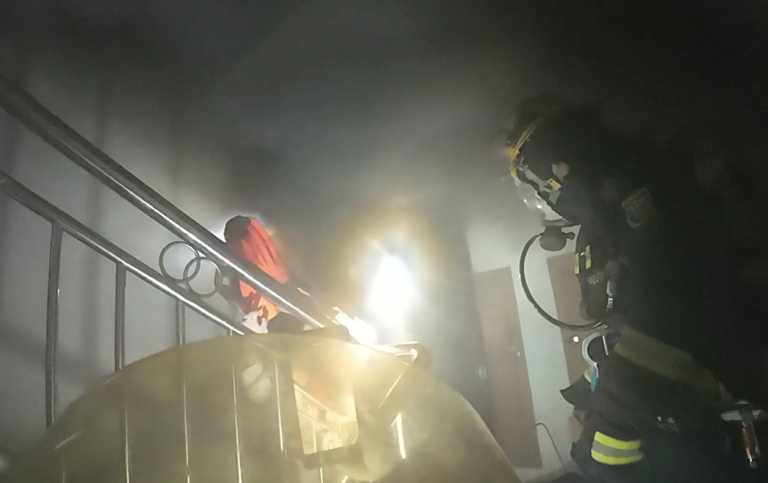 继续深入,在另一间卧室找到正护着小儿子的女主人。消防员立刻为孩子戴上呼吸面罩,指导母亲做好防护,将母子二人救出。