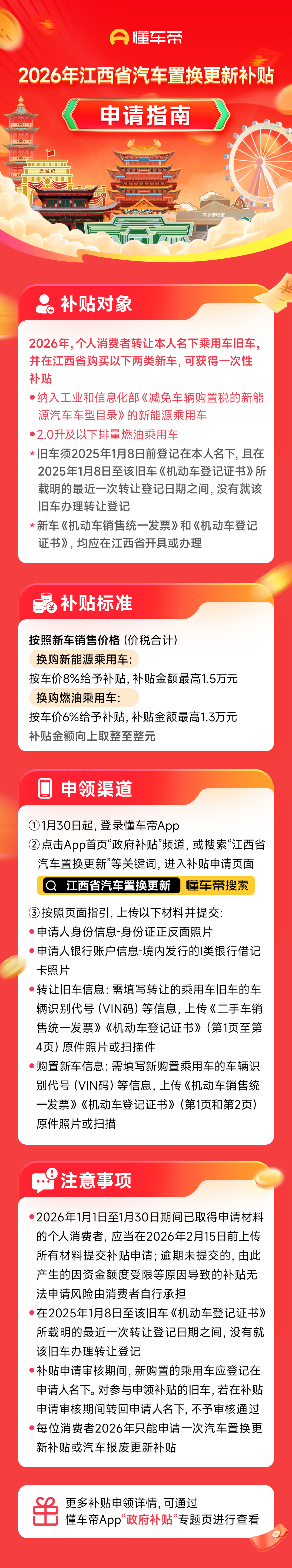 大江新闻讯 全媒体记者杜宇蔚报道:为持续释放汽车消费潜力,近日,江西省商务厅发布通告,2026年江西省汽车置换更新服务平台上线,先期开通本年度汽车置换更新补贴申请资料接收功能。即日起消费者通过懂车帝App“政府补贴”频道,或首页搜索“江西省汽车置换更新”等关键词,即可进入补贴申请页面。置换符合条件的新能源乘用车最高补贴15000元,燃油乘用车最高补贴13000元。