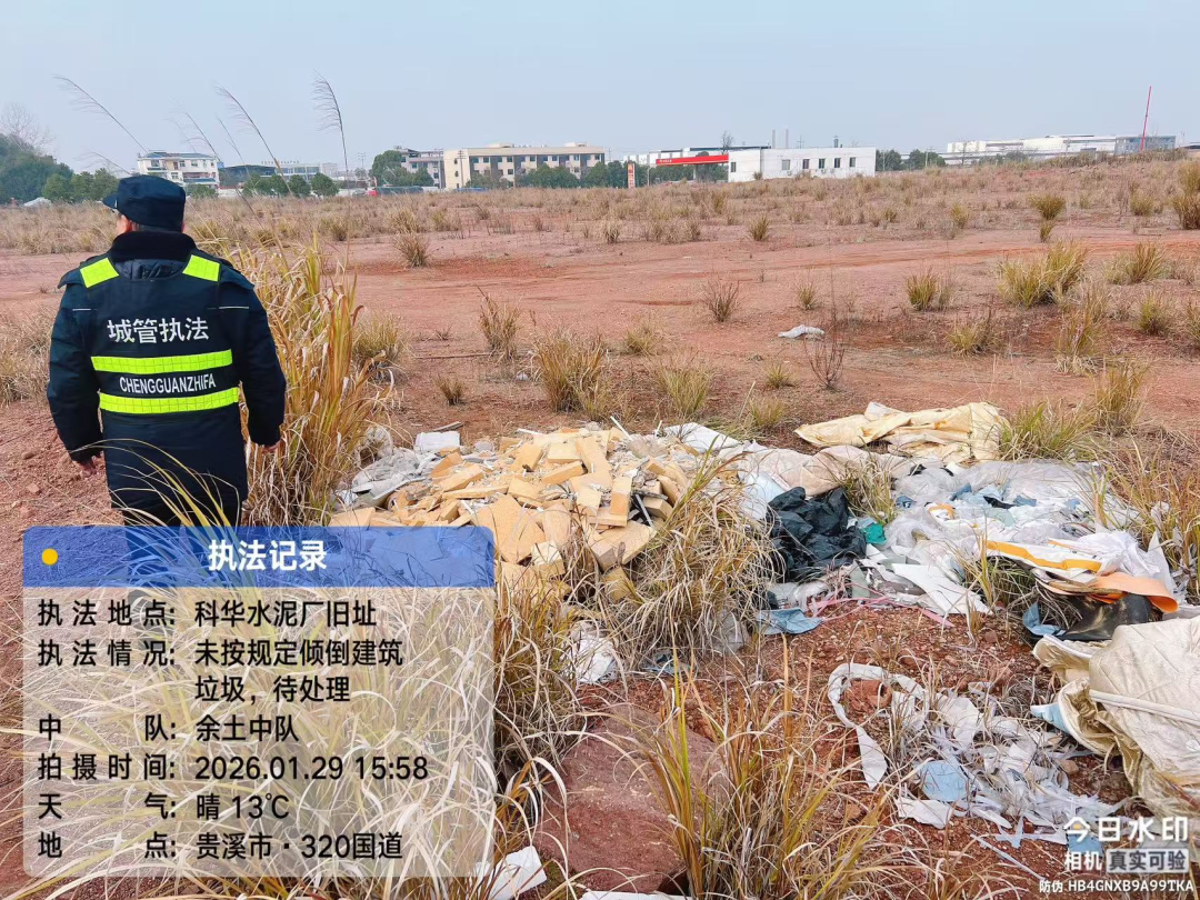 近日,贵溪市创建办联合执法组对320国道原科华水泥厂区开展专项执法整治行动,成功查处一起建筑垃圾与生活垃圾偷倒案件,有效维护了区域环境整洁。