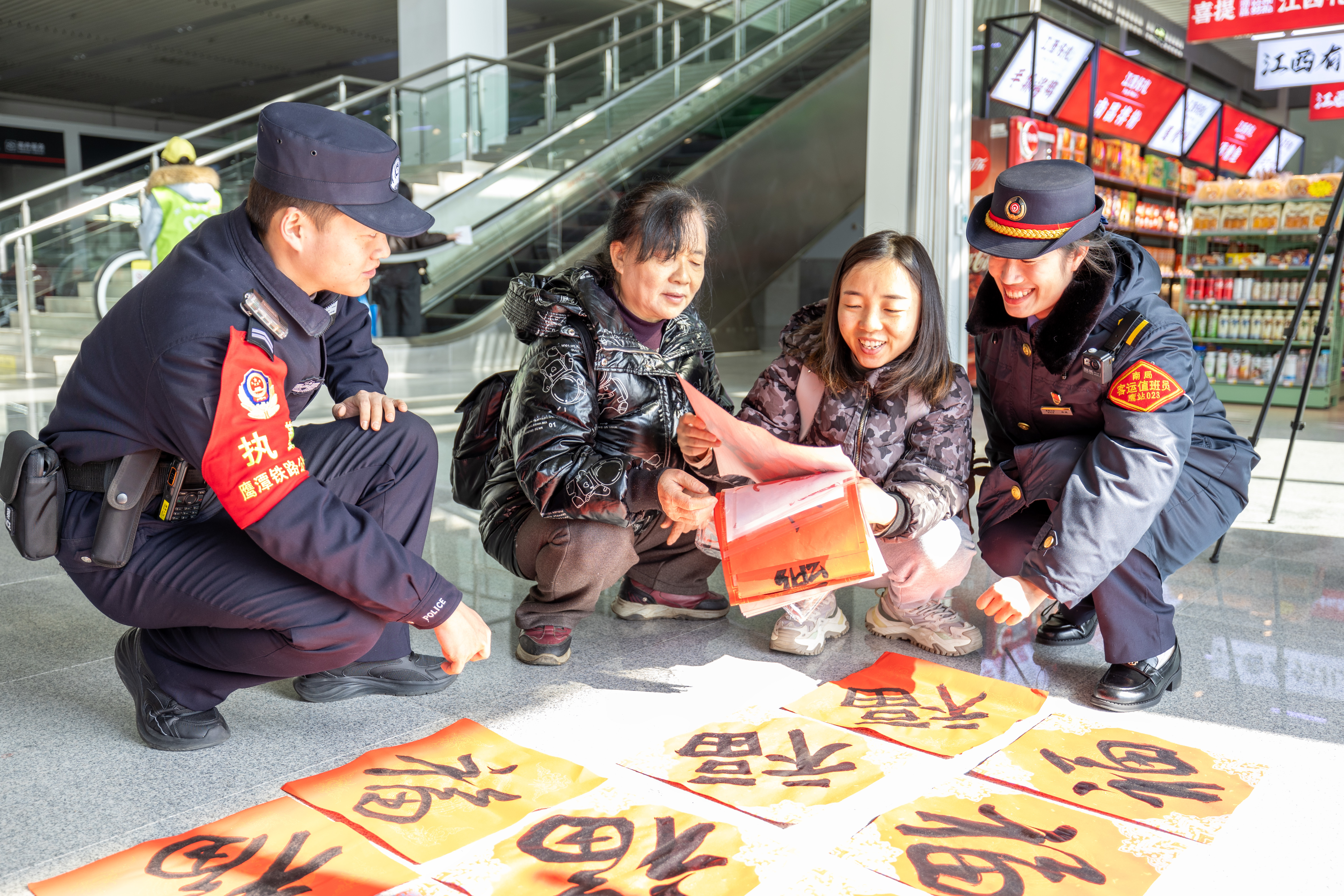 春运首日的鹰潭北站墨香四溢、暖意融融。在“万福迎春”活动现场,来自中国铁路南昌局集团有限公司文联书法分会、鹰潭铁路公安的书法家和书法爱好者们挥毫泼墨,将一副副春联、一个个“福”字送到旅客手中,让旅客把“福”带回家。
