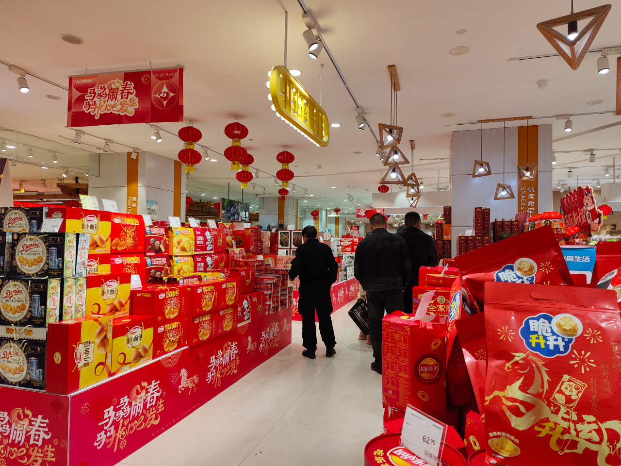 礼盒、奶制品、坚果等年货被摆放在超市的入口处,红色服装、饰品形成一个专区, 迎新特价海报被摆放在醒目位置……节前,我市各商场、超市也做足了准备,营造出浓厚的节日氛围。“孩子们过年都回来,所以来置办一些年货。现在的超市货品齐全,想买什么都有。”市民虞女士告诉记者,自己的女儿居住在外地,只有逢年过节女儿、女婿和外孙才得闲回家探望,于是早早地就备上他们爱吃的东西,等待新年团聚。