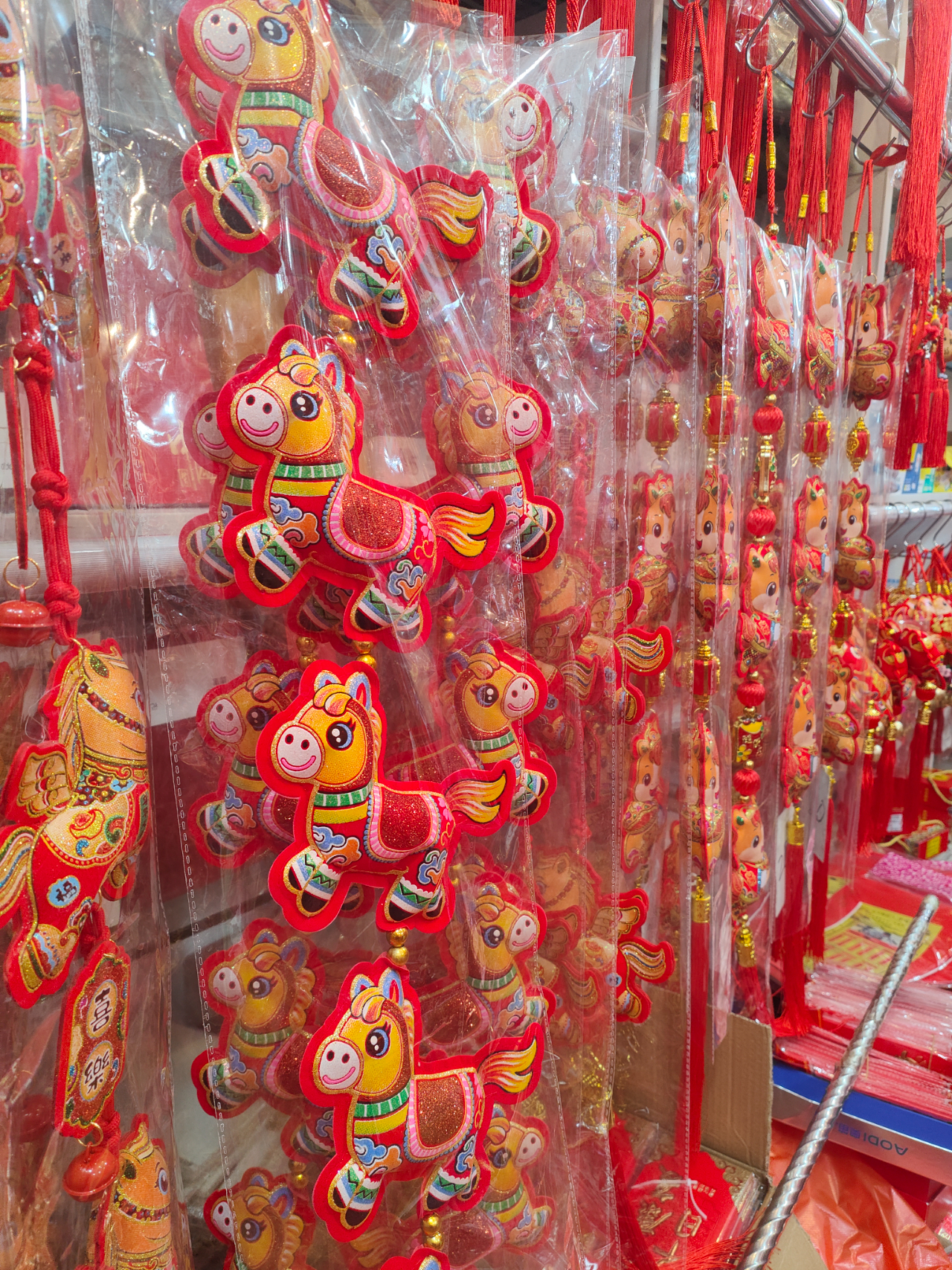 走进裕华百货商城,一片片“中国红”映入眼帘。绒布春联、烫金福字、中国结、生肖挂饰等传统年货琳琅满目。一位经营春联生意十余年的店主告诉记者:“相比往年,今年的春联、挂件等产品更加丰富齐全。新年挂件亮点是以生肖马为主题元素,而春联则相较以前纸质款,有了更耐用的绒布款,磁吸款等。”