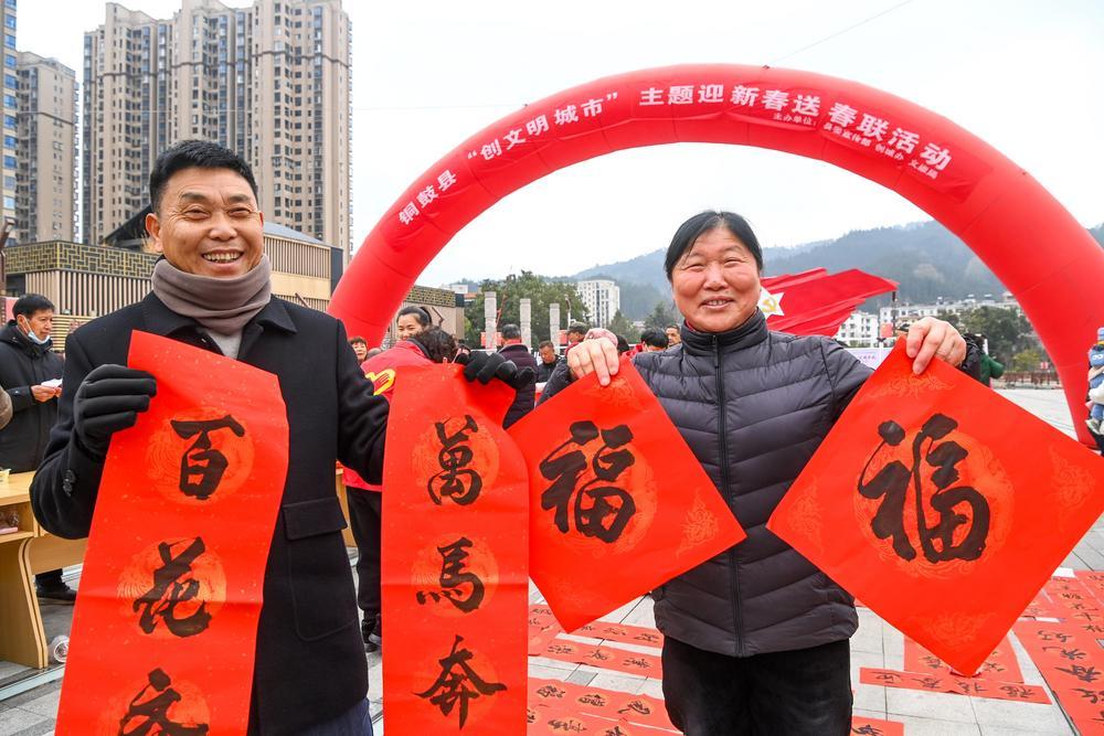 1月28日,铜鼓县秋收起义广场,领到免费春联的市民喜笑颜开。