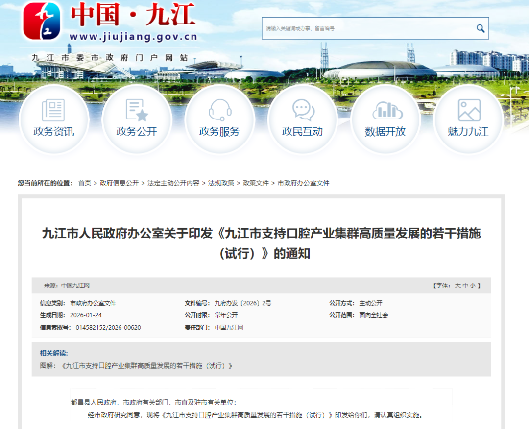为大力支持都昌县充分放大“万家门诊、十万牙医”资源优势,发展壮大口腔产业,打造“中国牙都”品牌,助力全市特色产业集群发展,特制定《九江市支持口腔产业集群高质量发展的若干措施(试行)》。