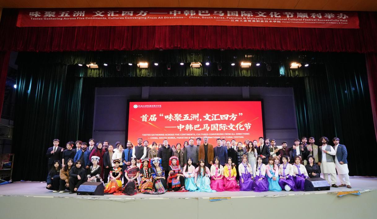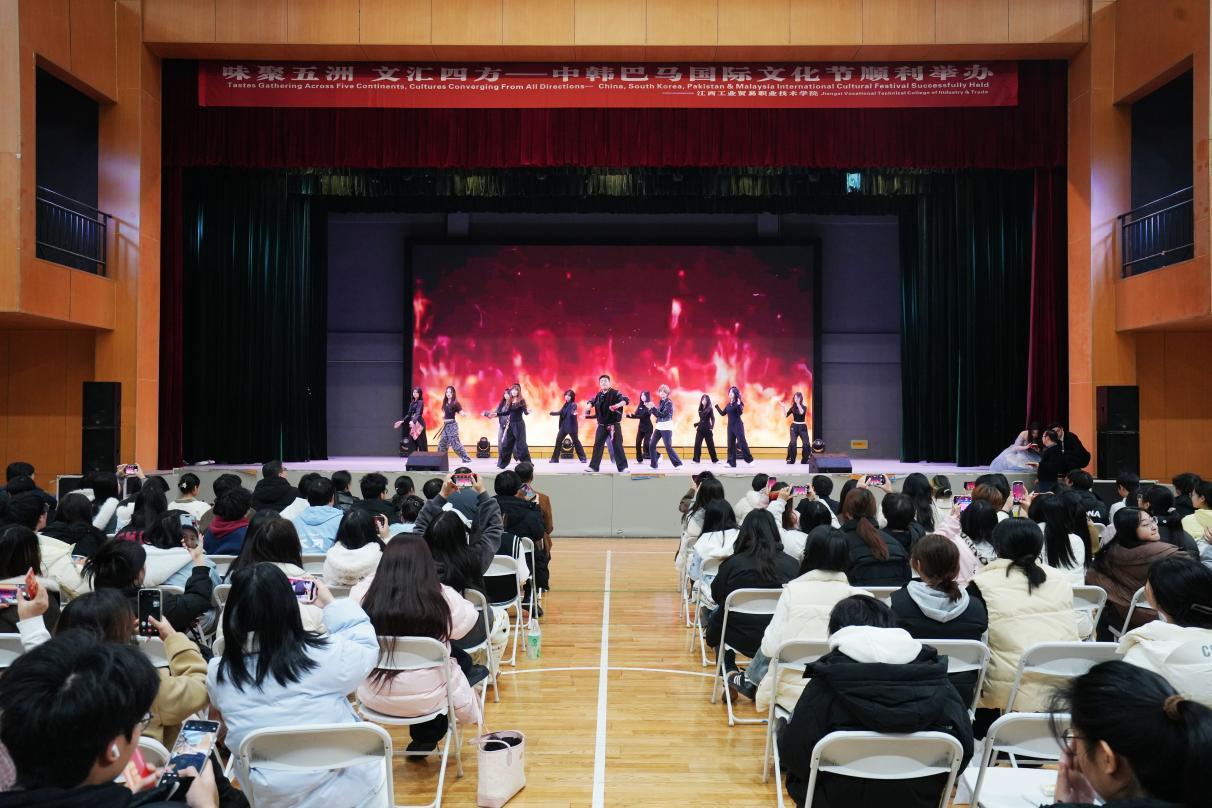 作为江西省首批具备全日制留学生招收资质的高职院校,江西工贸职院持续推进职教对外开放国际化办学。本届文化节是学院落实“引进来”和“走出去”战略的具体实践,也是深化中外职教合作、传播中华优秀传统文化的重要举措。活动现场设置多个特色展区,尽显文明互鉴氛围。各国美食区人气高涨,韩国辣炒年糕、中国传统点心、巴基斯坦椰浆饭、马来西亚鹰嘴豆沙拉同台亮相,以饮食为媒架起文化沟通桥梁;跨国文艺展演环节,四国学生联袂献上歌舞表演,展现青年活力,诠释“各美其美,美美与共”的交流理念。
