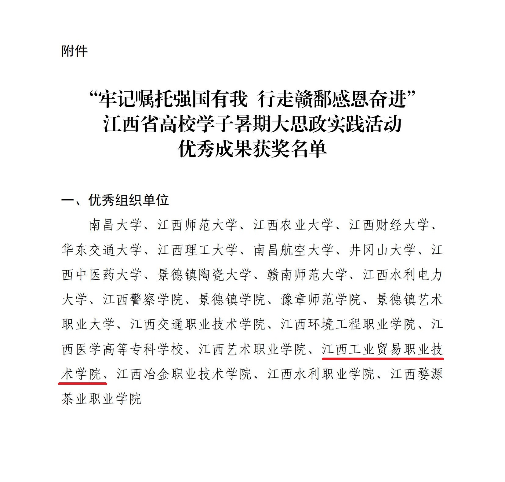 此次荣誉的取得,是江西工贸职院党委长期以来高度重视思政工作,落实立德树人根本任务、不断深化“大思政课”改革的结果,也是学院师生共同努力、积极参与社会实践活动的成果。未来,江西工贸职院将坚持不懈推动思政小课堂与社会大课堂深度融合,引导更多青年学子把个人理想追求融入强国建设和民族复兴伟业,在奋力谱写中国式现代化江西篇章中书写“牢记嘱托强国有我 行走赣鄱感恩奋进”的工贸青春答卷。(孙丹青)