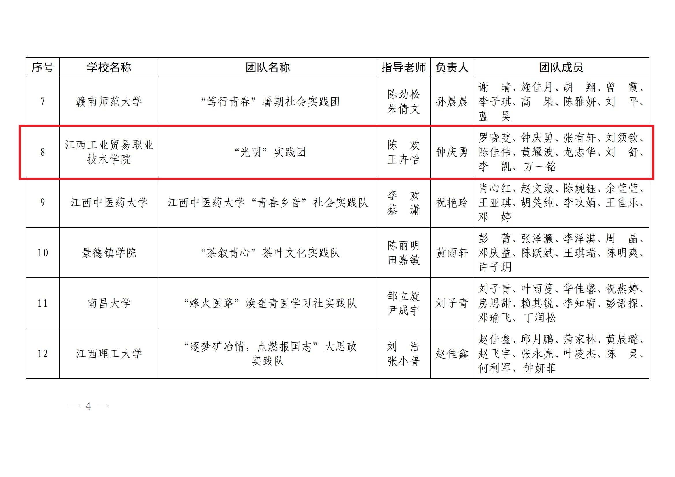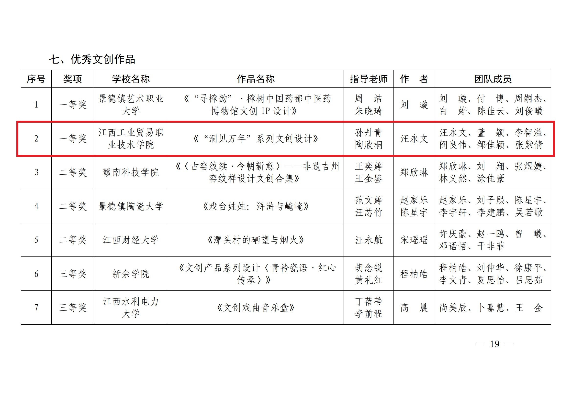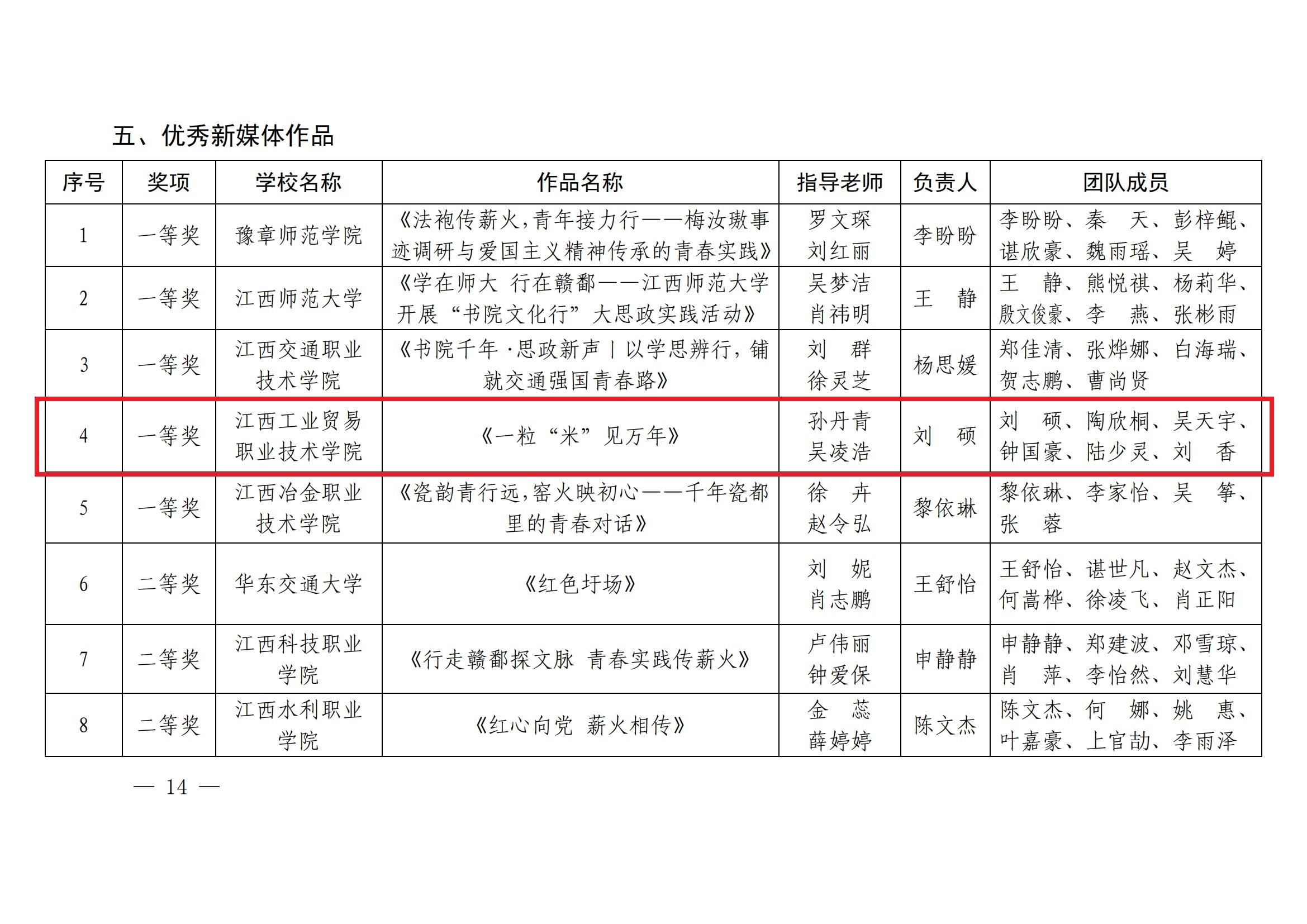 江西工业贸易职业技术学院获评“优秀组织单位”,机电工程系“光明”实践团获评“优秀实践团队”,学院孙丹青荣获教师组“优秀实践个人”称号,经济贸易系蔡欢欢荣获学生组“优秀实践个人”称号,党委宣传部、粮油·建艺系选送的《一粒“米”见万年》获优秀新媒体作品一等奖,党委宣传部、粮油·建艺系选送的《“洞见万年”系列文创设计》获优秀文创作品一等奖。