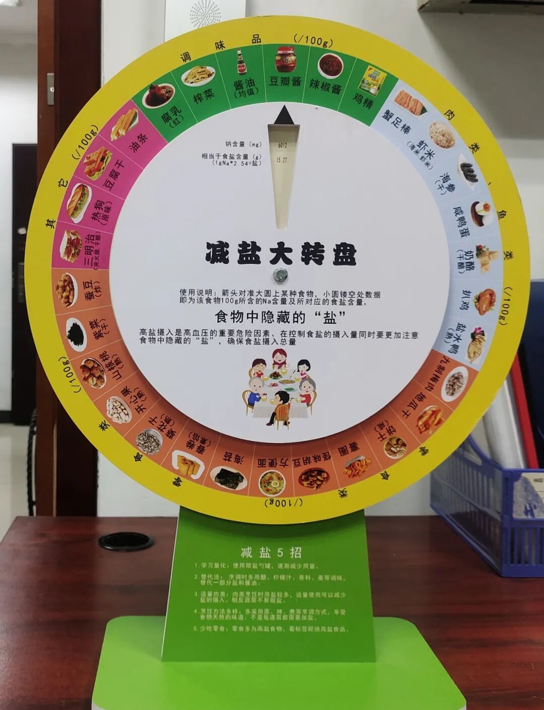 南院门诊护理团队从患者的实际生活场景出发,将专业的控盐知识与趣味互动结合,精心打造了“减盐大转盘”宣教工具。 转盘的每一个扇区都藏着健康干货,既有“成人每日盐摄入≤5克”“隐形盐藏在酱菜、零食里”等核心知识点,也有“多用醋、葱姜蒜调味”“选择低钠盐”等实用小妙招;转动转盘,箭头对准你常吃的食物(比如怪味胡豆、九制梅肉),中间小圆窗就会显示该食物100g的钠含量,以及对应的食盐量,将枯燥的健康知识变成了看得见、摸得着的趣味体验,来院的患者记住了减盐要点,彻底告别“凭感觉放盐”的误区。
