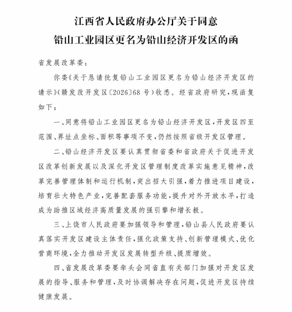 2026年2月3日,接《江西省人民政府办公厅关于同意铅山工业园区更名为铅山经济开发区的函》(赣府厅字〔2026〕5号)正式通知,“铅山工业园区”正式更名为“铅山经济开发区”。此次成功更名,标志着铅山工业园区实现历史性转型,从以工业制造业为主的工业园区,蝶变为外向型经济特征更突出、现代化制造业集聚更明显、科技创新动能更强劲、绿色发展底色更鲜明的高能级多元经济平台,为铅山县产业高质量发展开辟了新空间、注入了新动能。