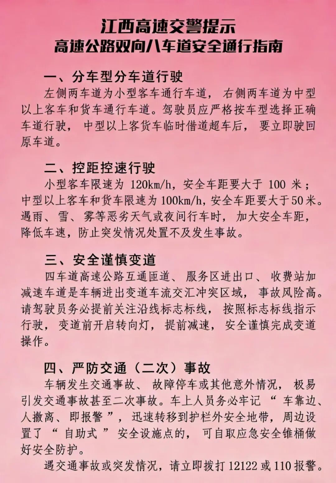 小型客车限速为120km/h,安全车距要大于100米;中型以上客车和货车限速为100km/h,安全车距要大于50米。遇雨、雪、雾等恶劣天气或夜间行车时,加大安全车距,降低车速,防止突发情况处置不及发生事故。
