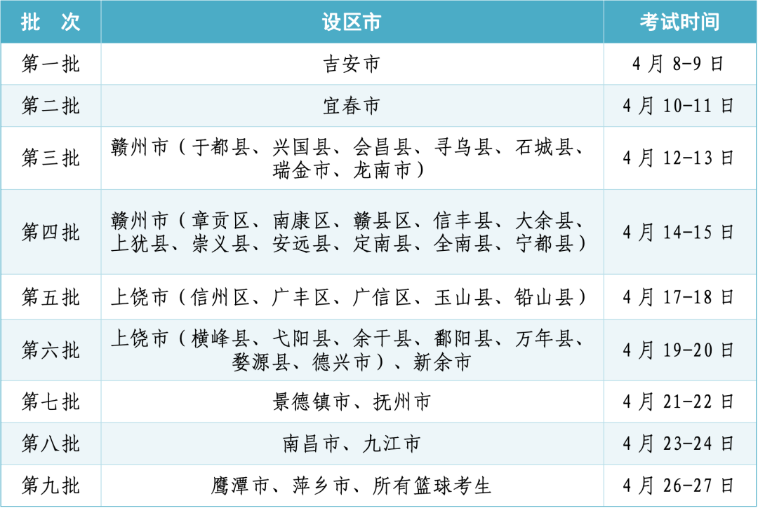 注:第1-8批次全部为足球考生,第9批次为鹰潭市、萍乡市足球考生和所有篮球考生,所有缓考均安排在第9批次进行。4月16日、25日休息。