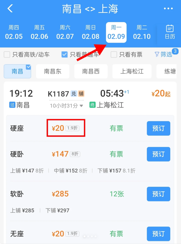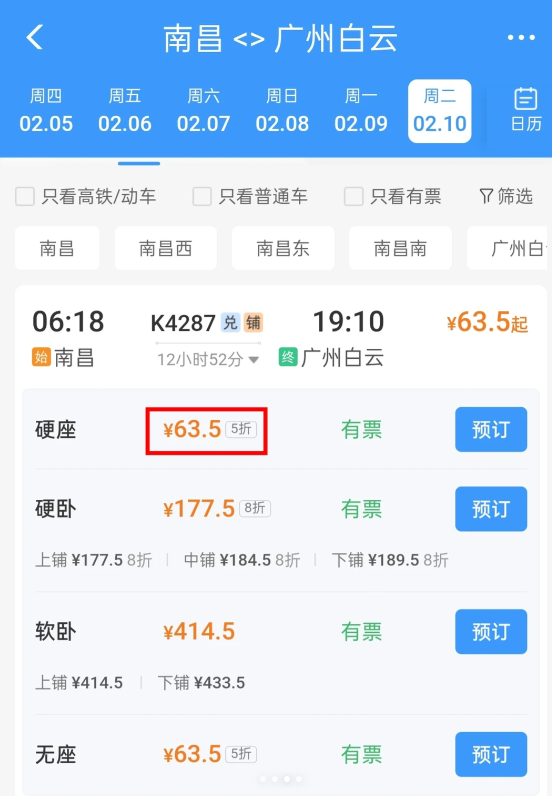 比如节前, 2月9日至14日K1187次南昌 至上海松江硬座打1.9折、全程20元, 2月9日至2月14日K4287次南昌 至广州白云硬座打5折、全程63.5元, 2月9日至12日K4404次南昌 至温州硬座打4.9折、全程25元,南昌至鹰潭、丰城、樟树、新余、宜春、萍乡、上饶方向,折扣后票价仅需4.5元--21.5元不等。旅客朋友可通过铁路12306查询具体票价信息,根据自身实际需求购买。