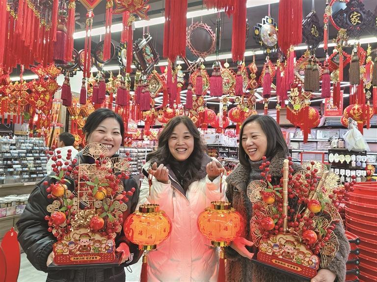 2月3日,饶城市民在小商品超市开心选购春节饰品扮靓家居,喜迎新春佳节。