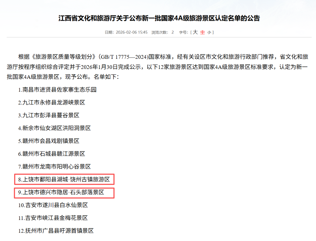 2月6日,江西省文化和旅游厅发布新一批国家4A级旅游景区认定名单的公告,上饶市鄱阳县湖城·饶州古镇旅游区、上饶市德兴市隐居·石头部落景区,被认定为国家4A级旅游景区。目前,我市有5A级景区4家,4A级景区37家。