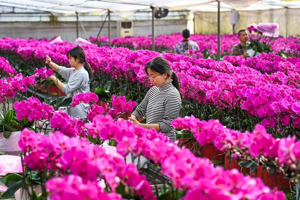 2月3日,樟树市大桥街道绿城园艺有限公司的花卉大棚内,工作人员正在分拣、包装蝴蝶兰,以供应节日市场。